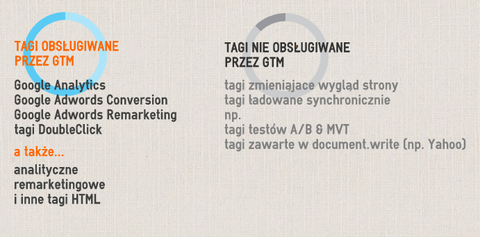 Poza standardowymi szablonami tagów Google (Analytics, Adwords, Doubleclick), GTM obsługuje także niestandardowe tagi HTML. Daje to możliwość modyfikacji kodów Google, oraz zastosowania innych tagów.