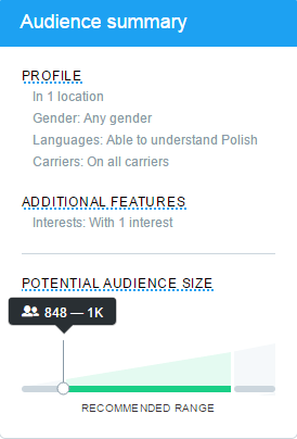 W momencie, gdy wybieramy różne opcje targetowania po prawej stronie pojawia się estymacja, która przedstawia szacowaną wielkość grupy odbiorców, do której możemy kierować reklamę. Twitter pokazuje czy mieści się ona w rekomendowanym przedziale. Jeśli jest zbyt mała, reklamy mogą nie przynieść oczekiwanego efektu.