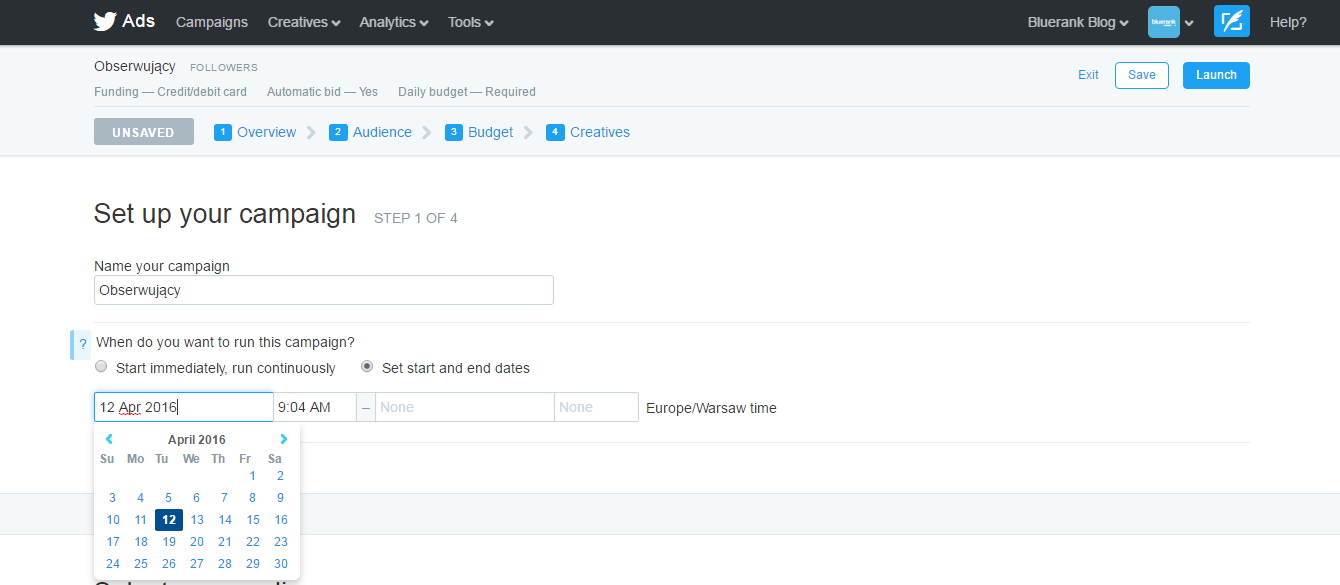 3. Strona tworzenia kampanii składa się z 4 obszarów. W pierwszej kolejności należy nadać nazwę kampanii oraz ustawić daty startu oraz zakończenia.
