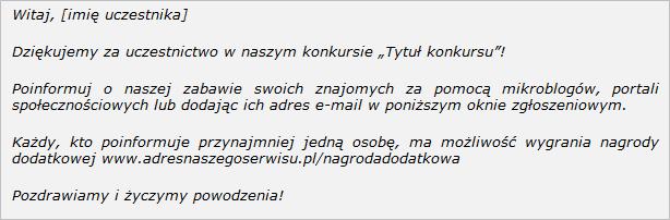 Możecie również zorganizować konkurs, w którym poprzez odpowiednio skonstruowany regulamin, od każdego uczestnika będziecie wymagać umieszczenia linków do Waszej strony. Niestety, nie we wszystkich przypadkach można sobie na to pozwolić. Jeżeli zadaniem konkursowym będzie np. dodanie wpisu na blogu lub stworzenie nowego topicu na forum na zadany temat, możecie pokusić się o zamieszczenie takiej informacji w regulaminie: