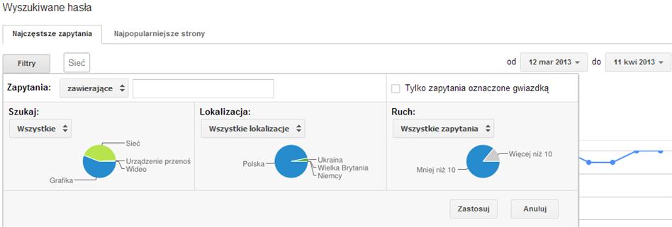 Przy okazji sprawdzania danych w GWT, możemy również sprawdzić, czy pozycje w Narzędziach dla Webmasterów pokrywają się z tym, co widzimy, korzystając z wyszukiwarki. Interesujące nas dane znajdują się w dziale Ruch –> Wyszukiwane hasła. Narzędzie to posiada również rozbudowane możliwości filtrowana danych, które pozwalają zawęzić raport do interesującej nas części.