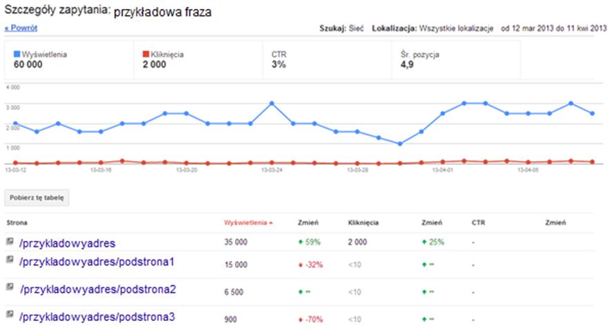 Na powyższym zrzucie ekranu widać na przykład, jak często dane podstrony pojawiają się w wynikach wyszukiwania po „przykładowej frazie” oraz ile wynoszą liczby kliknięć.
