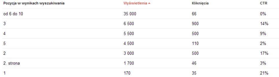 Według danych powyższego raportu, serwis pojawia się najczęściej (35 000 wyświetleń) na pozycjach od 6 do 10. Drugim najczęstszym miejscem jest pozycja 3, na której w ostatnich 30 dniach serwis pojawił się 6500 razy, z czego wyniknęło 900 kliknięć, co oznacza CTR na poziomie 14%. W raporcie widać również, że strona pojawiała się też na miejscu 1 (170 wyświetleń, 35 kliknięć), gdzie CTR wynosił 21%.